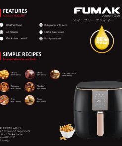 – Nồi chiên không dầu Fumak là giải pháp nấu ăn lành mạnh, giúp chiên rán đồ ăn một cách nhanh chóng mà không cần dầu mỡ. Công nghệ nhiệt đối lưu tiên tiến nhất của Fumak giúp thực phẩm chín đều một cánh nhanh chóng và tiết kiệm điện đến 50% so với các loại nồi thường. Nồi chiên với công nghệ tách dầu ưu việt giúp loại bỏ tới 80% dầu mỡ dư thừa trong thực phẩm, giúp bảo vệ sức khỏe của bạn và gia đình.